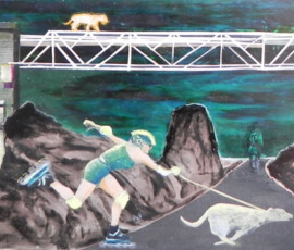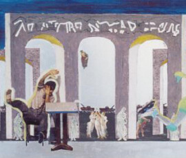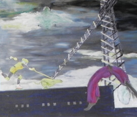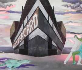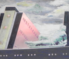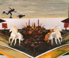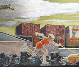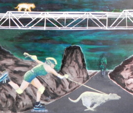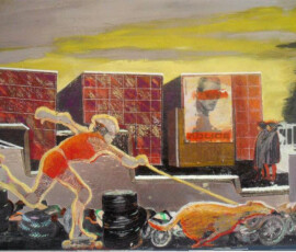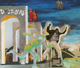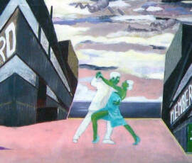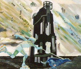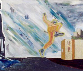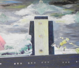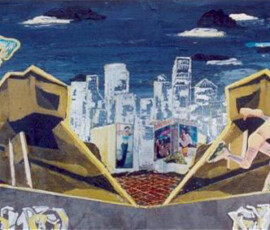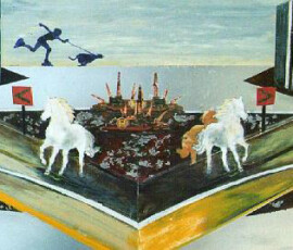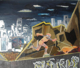 Il paradiso non era possibile 2004 insiste sull’idea di ambivalenza e ambiguità di ciò che chiamiamo progresso e sviluppo. L’opera nasce come installazione composta di otto pannelli di alluminio montati su lastra di metallo che propongono un viaggio immaginario attraverso paesaggi e luoghi in cui si fondono e si sovrappongono città e complessi industriali, chiese e freddi contenitori di morte mentre la Terra si svuota di esseri Umani. Una sola figura umana, replicata in ogni pannello, quella della pattinatrice lanciata a tutta velocità con il suo cane, è lì ad evocare la leggenda della dea indiana Avatar, che corre per il mondo tentando di spargere consapevolezza fra gli esseri umani. Dalla costruzione iniziale di piccoli paesaggi urbani e di periferie industriali su tavole di legno sono passata a lavorare su lastre più grandi di alluminio usando sia la tecnica del collage che quella della pittura: la tecnica del collage per rappresentare gli elementi del paesaggio inventati e costruiti dalla fantasia dell’essere umano come palazzi, strade, ponti, etc.; la pittura per rappresentare l’elemento organico del paesaggio, come cielo e natura, che da sempre fanno da sfondo all’evoluzione millenaria della storia e della vita dell’uomo. I pezzi di carta, considerati normalmente scarti inservibili, recuperati, sono diventati una metafora per la ricostruzione possibile di una nuova realtà dalle rovine morali e fisiche del passato. Il loro ri-utilizzo in un lavoro di arte ha assunto la valenza metaforica di una rinascita e trasformazione attraverso la ricostruzione dalle rovine, di una realtà alternativa. Il paradiso non era possibile 2004 Serie di 8 lavori, tecnica mista su alluminio, 30×84 cm.