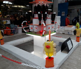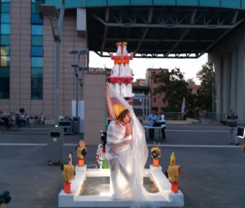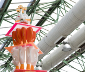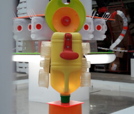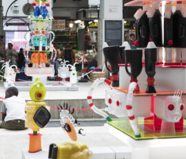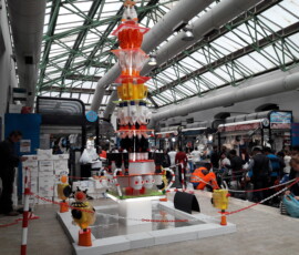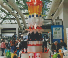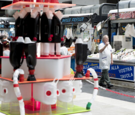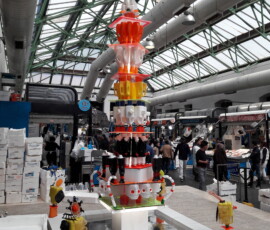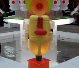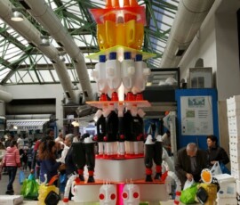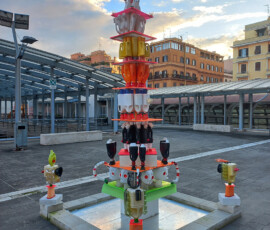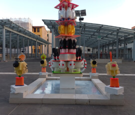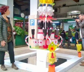 Opera realizzata per Il Mercato Esquilino su richiesta dell’Associazione dei commercianti (CO.RI.Me.) In occasione del Natale di Roma 2021 (ferro, legno, cartone, policarbonato, metacrilato, plastiche varie di scarto, viti, fil di ferro, luci al led – 365x210x210) |